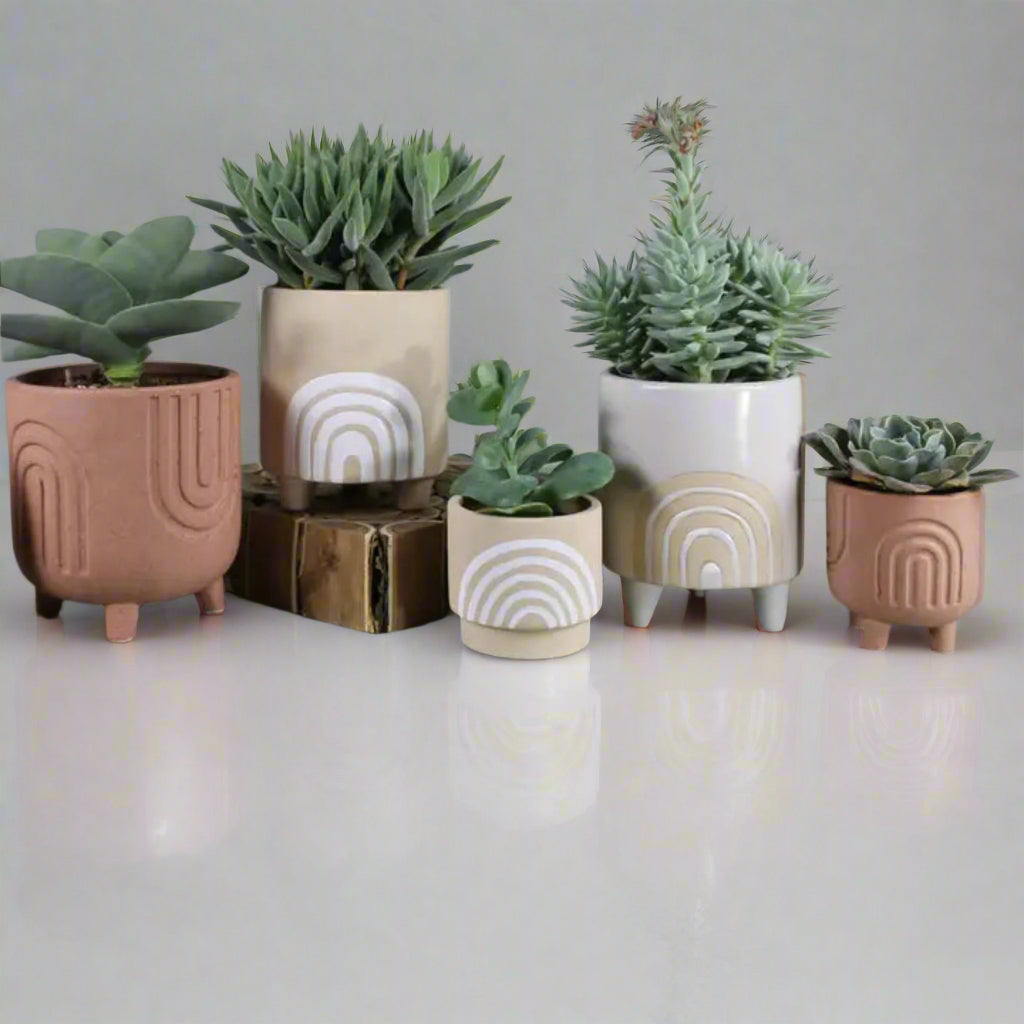 A graphic arc in an inverse pattern surrounds this rust-hued ceramic vessel and elicits the happiness of seeing a rainbow, over and over again. Size: 5"x5"